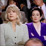 Then against her staff's advice, the unprepared Suzanne appears on the political show Crossfire, where John Sununu and Michael Kingsley begin to drill her about her political affiliation, gays in the military, etc. Then they accuse Suzanne of "trying to make a profit from a federally funded enterprise," by selling her retarded brother's homemade ceramic spoon-rests at the House gift shop.